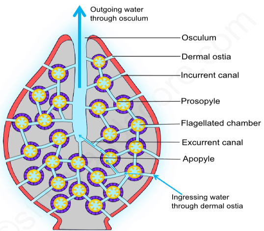 - Ostia → Incurrent canals → Prosopyles → Radial canals → Apopyles → Excurrent canals → Spongocoel → Osculum
