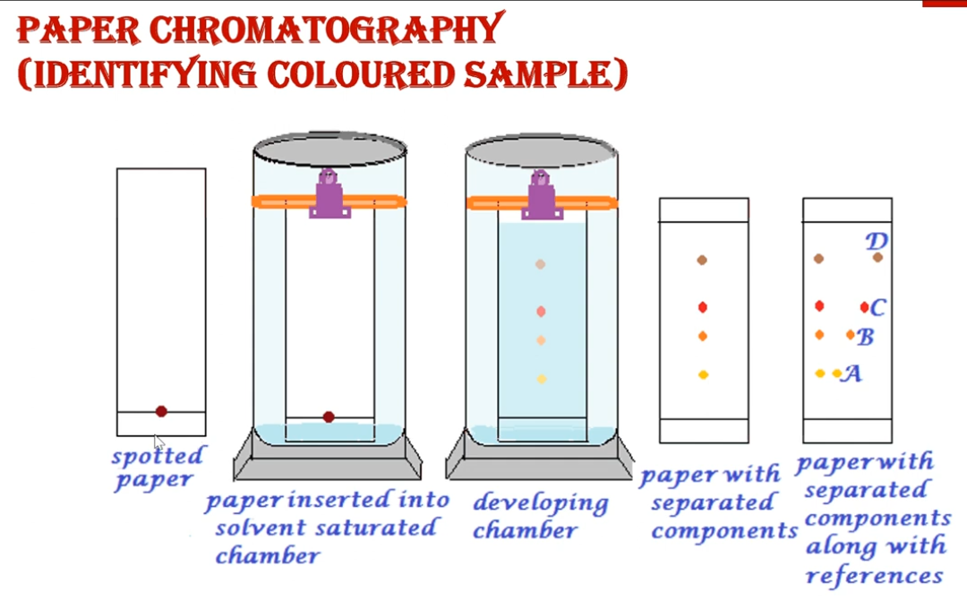 i) Ascending paper chromatography: In this process, solvent is present in a dish in the base. The liquid moves toward upside of the paper by capillary movement against to gravitational pull.